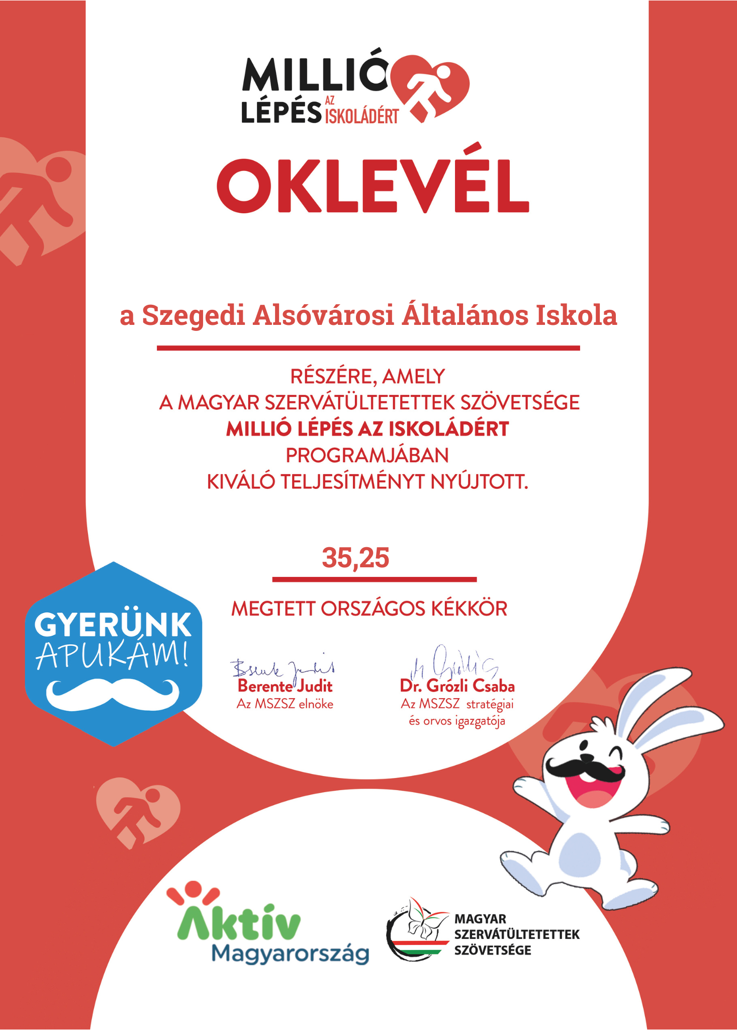 Harmadik alkalommal csatlakozott iskolánk a „Millió lépés az iskoládért” felhíváshoz. Iskolánk nagyszerűen szerepelt a kihívásban, melyben nem csupán a gyermekek, hanem szüleik, rokonaik, ismerőseik, barátaik is részt vettek. Nagyszerű lehetőség volt egy közös cél érdekében összefogni!